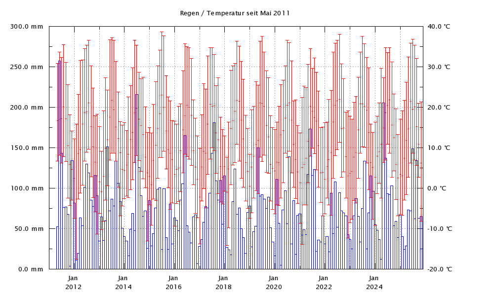 Monatlicher Niederschlag und Max-/Min-Temperatur seit Mai 2011 (in monatlichen Meßintervallen)