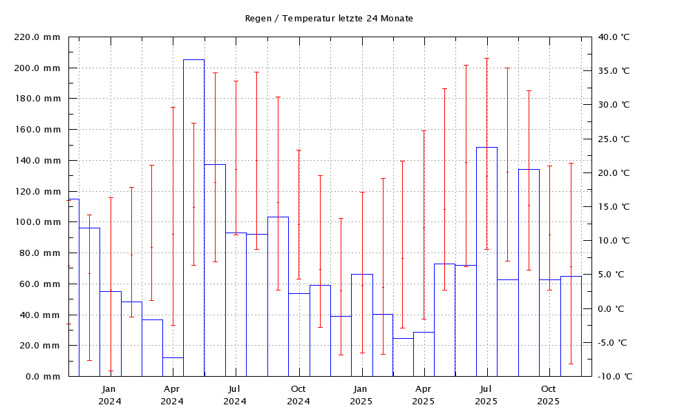 Monatlicher Niederschlag und Max-/Min-Temperatur für die letzten 2 Jahre (in monatlichen Meßintervallen)
