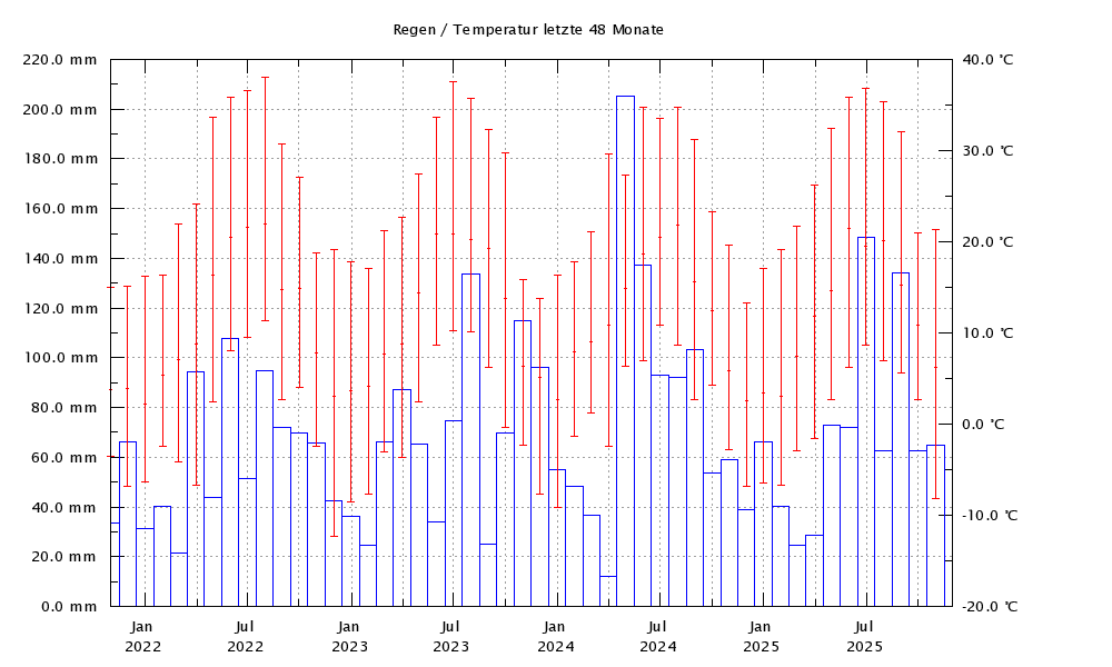 Monatlicher Niederschlag und Max-/Min-Temperatur für die letzten 4 Jahre (in monatlichen Meßintervallen)
