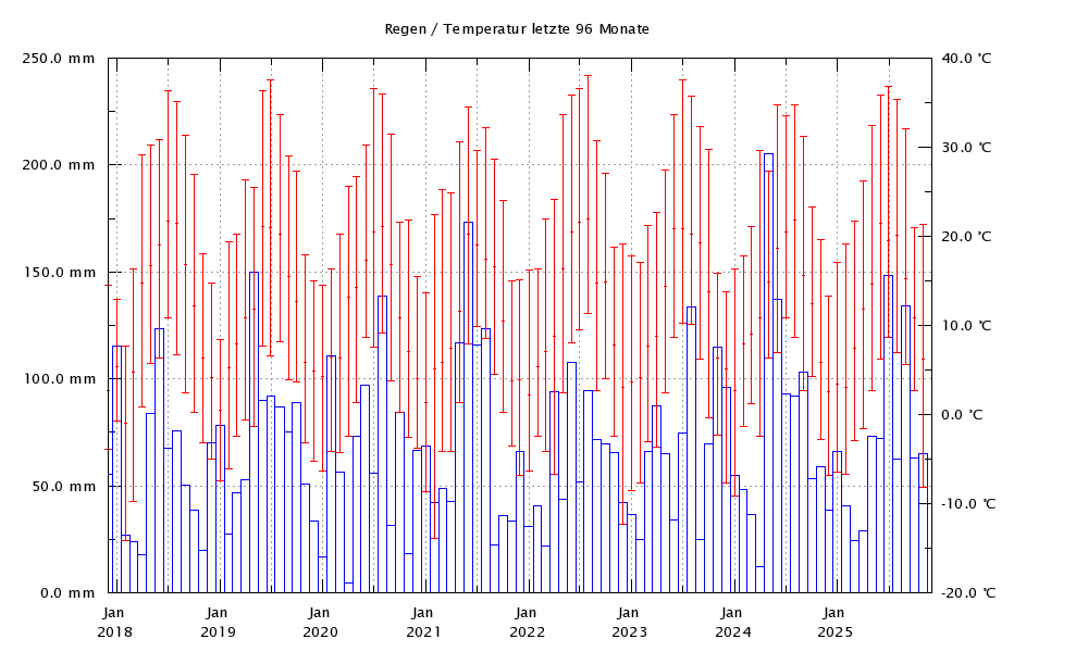Monatlicher Niederschlag und Max-/Min-Temperatur für die letzten 8 Jahre (in monatlichen Meßintervallen)