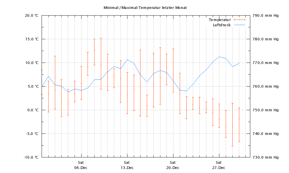 Tägliche Min/Max-Außentemperaturen für die letzten 4 Wochen